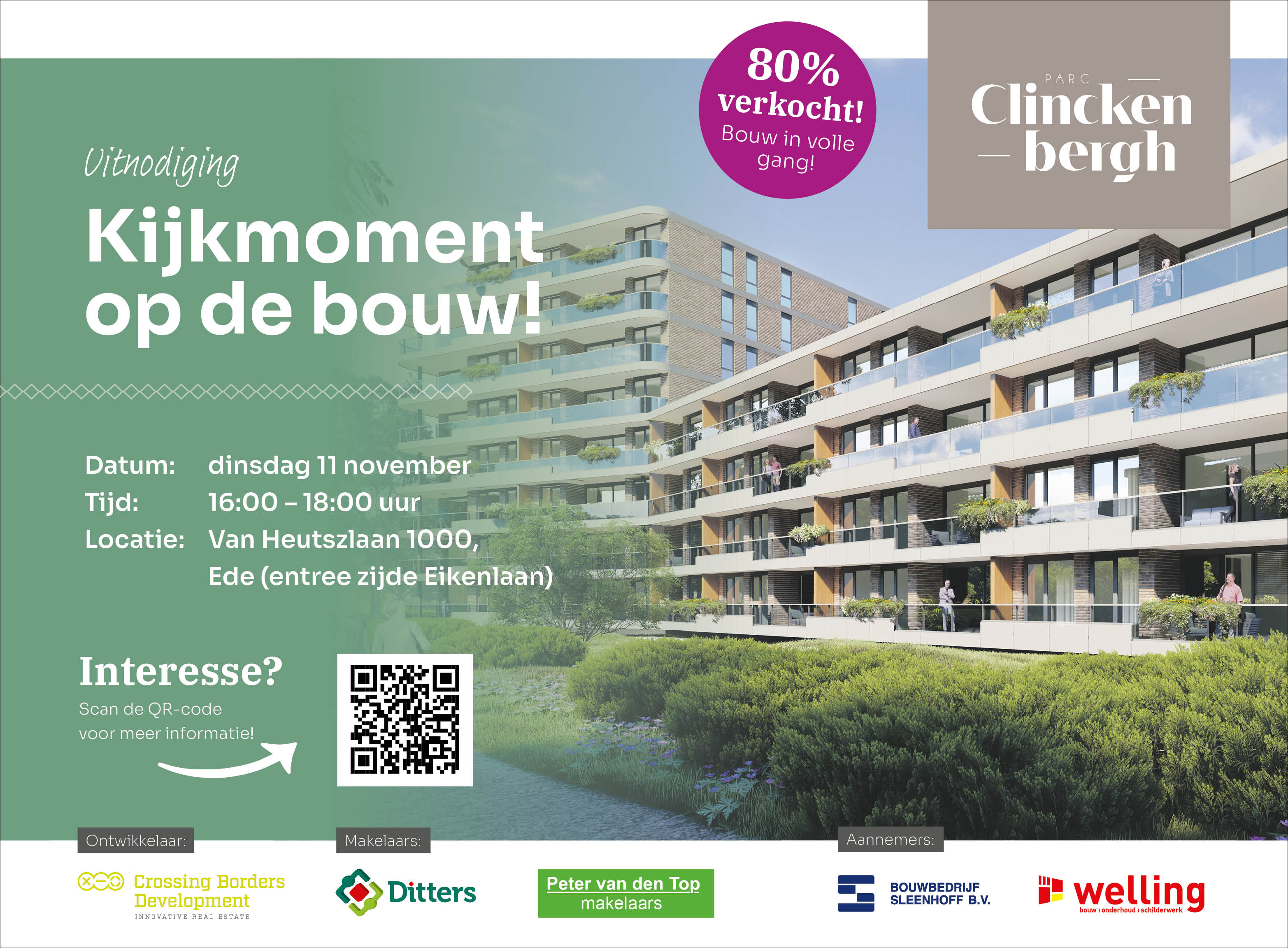 Op dinsdag 11 november a.s. organiseren wij samen met de aannemer en de makelaars een kijkmoment op de bouw rondom nieuwbouwproject Parc Clinckenbergh. Vanaf 16:00 uur bent u van harte welkom op locatie aan de Van Heutszlaan 1000 in Ede.